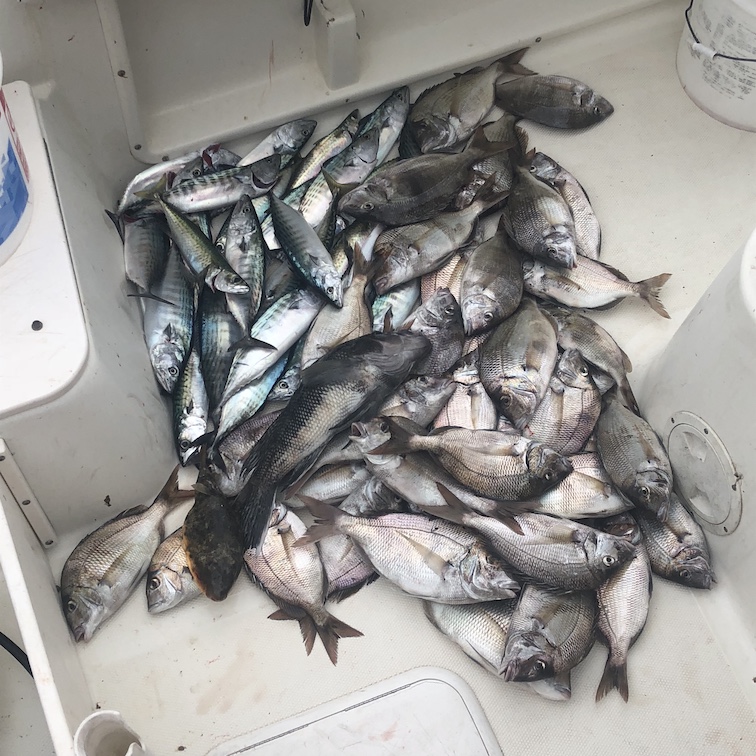 Rico and Anthony on the "Goldfish" Were back on the Reef and did a bang up job on porgies, then hit the local schools of bonita and a few mackerel on Deadly Dicks