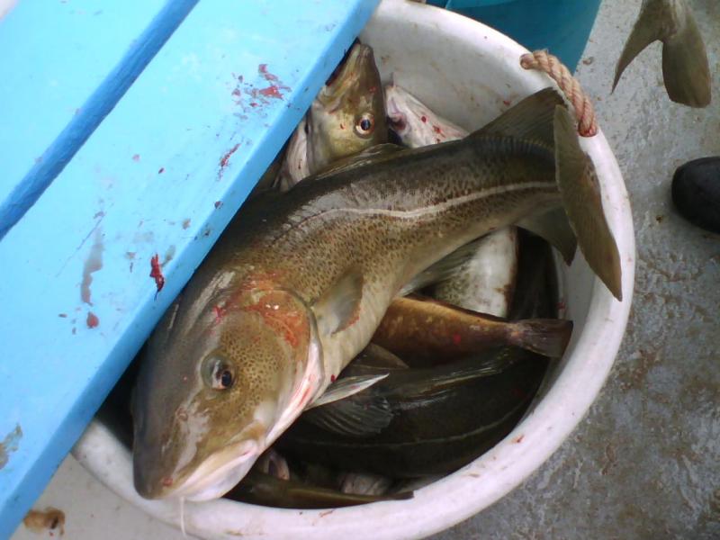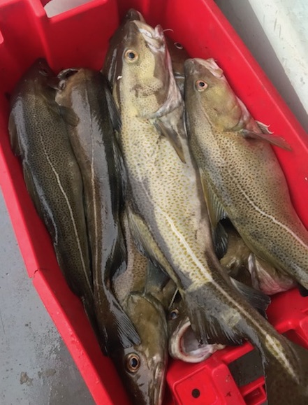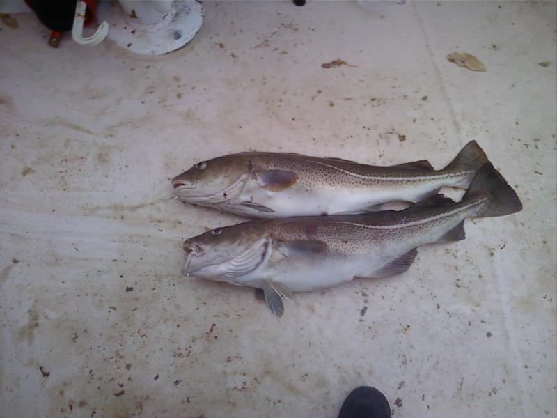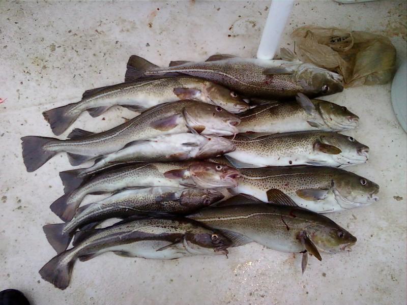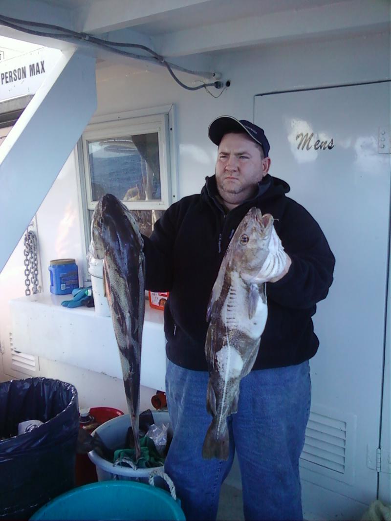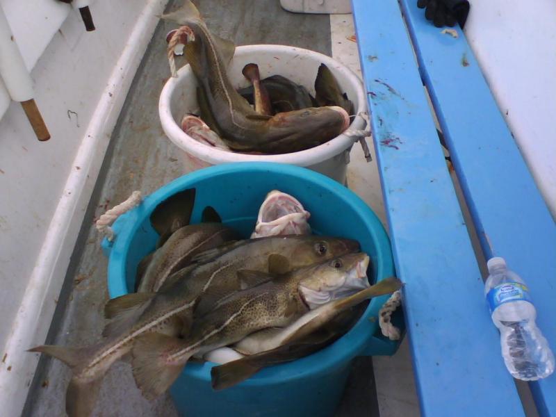 The Capt.Lou sailed with 28 of us on a charter.Myself and P.Baressi teamed up with fisherman George and friends to do a job on the cod. The seas were a bit sloppy early 4-6 ft with occasional 8ft wave thrown in for good measure. The fishing on the hook was a bit slow to start. We waited for the right stage of tide. The bite turned on as expected. Fishing was good for over an hr and we had close to a limit for the whole boat. After the bite slowed again we picked a few here and there. The seas eventually laid down a bit, due to constant n/w winds. The trip in was in only 3ft seas. Capt gave us a long day again as he tried a few drops for some ling once we had a limit of cod. The ling didn't turn on and we headed in late. The crew was cutting fish the whole ride in after working the deck perfectly all day, never leaving you waiting for a gaff if you needed it.