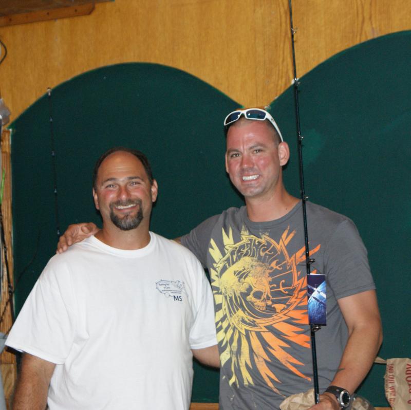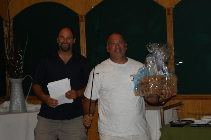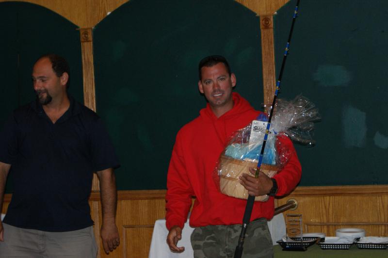 Second place winner in the 2013 tournament, Tom D'Angelo with his Atlantic Custom bucktailing spinning rod donated by Fishingunited. com, and a Sponsor donated tackle basket.