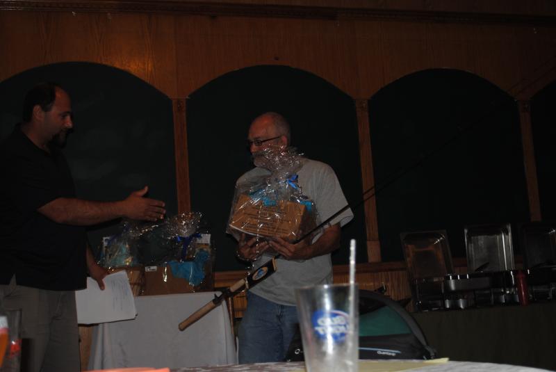John Wittner has his hands full with his prizes as he won a Tsunami Classic baitcast rod donated by Stella Maris Bait and Tackle , and a tackle basket from our sponsors.