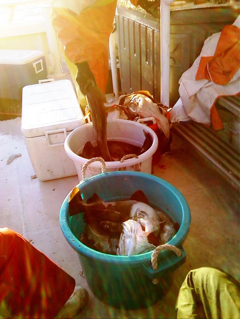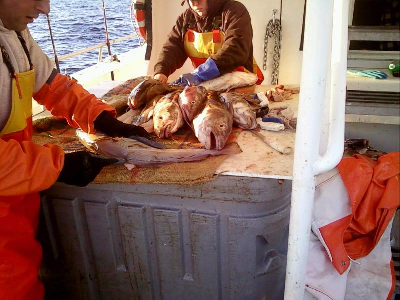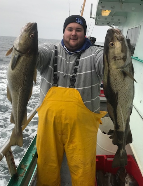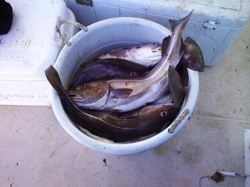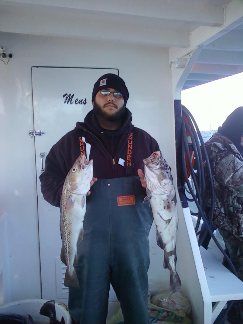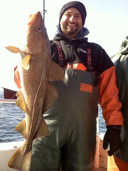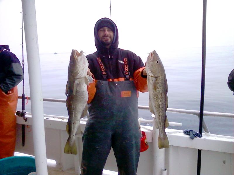 The Capt.Lou sailed with 28 of us on a charter.Myself and P.Baressi teamed up with fisherman George and friends to do a job on the cod. The seas were a bit sloppy early 4-6 ft with occasional 8ft wave thrown in for good measure. The fishing on the hook was a bit slow to start. We waited for the right stage of tide. The bite turned on as expected. Fishing was good for over an hr and we had close to a limit for the whole boat. After the bite slowed again we picked a few here and there. The seas eventually laid down a bit, due to constant n/w winds. The trip in was in only 3ft seas. Capt gave us a long day again as he tried a few drops for some ling once we had a limit of cod. The ling didn't turn on and we headed in late. The crew was cutting fish the whole ride in after working the deck perfectly all day, never leaving you waiting for a gaff if you needed it.